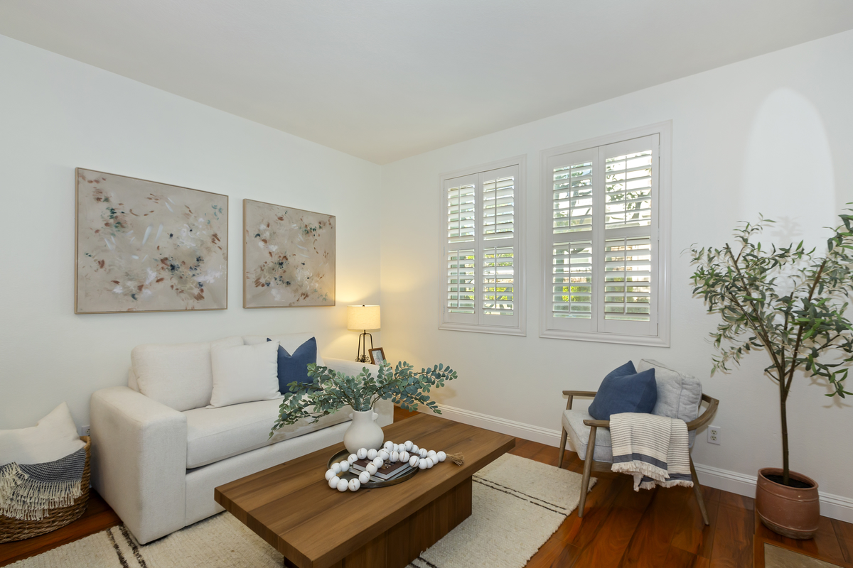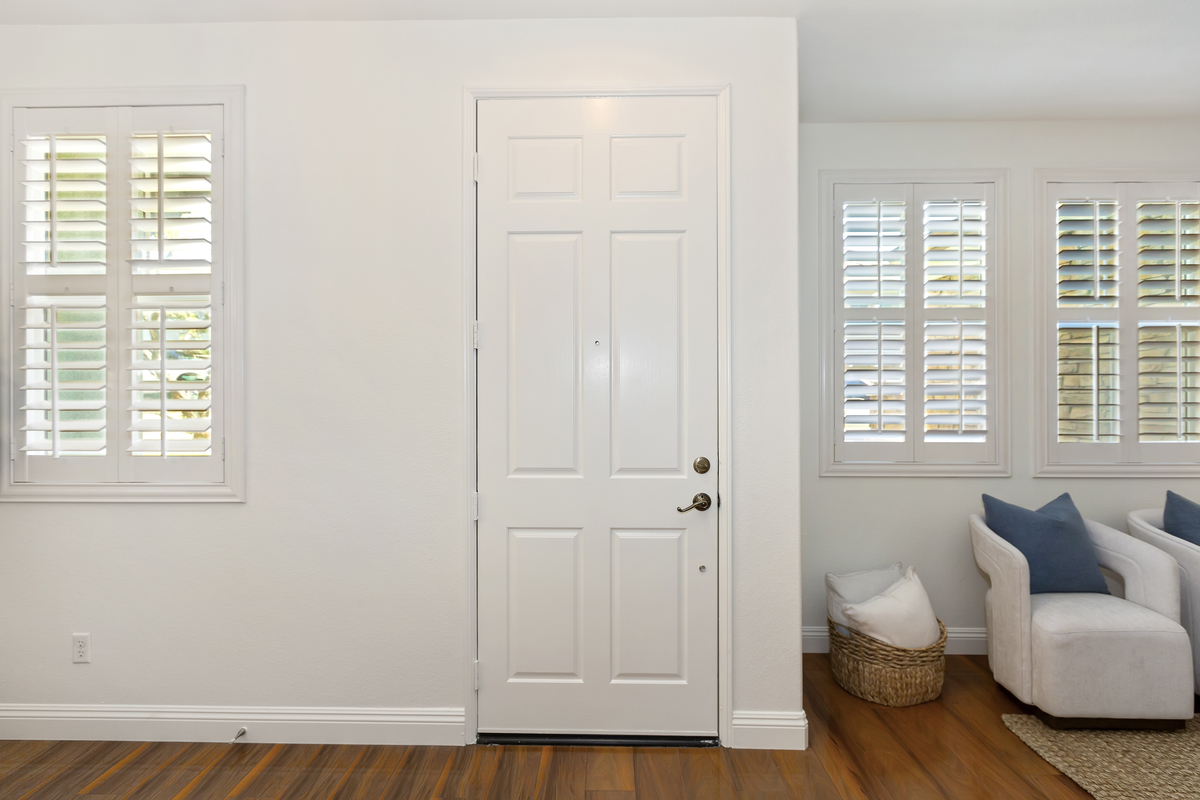 The interior features laminated wood flooring, high ceilings, and abundant natural light enhanced by numerous windows with plantation shutters. The inviting family room with fireplace flows seamlessly into the kitchen, creating a warm and connected living space. The kitchen includes new stainless steel appliances, a convenient breakfast bar, and ample cabinetry. The dining area opens to a versatile living room or flex space, ideal for a home office, formal sitting area, or additional entertaining area. The home has been well maintained and remains in excellent overall condition.
