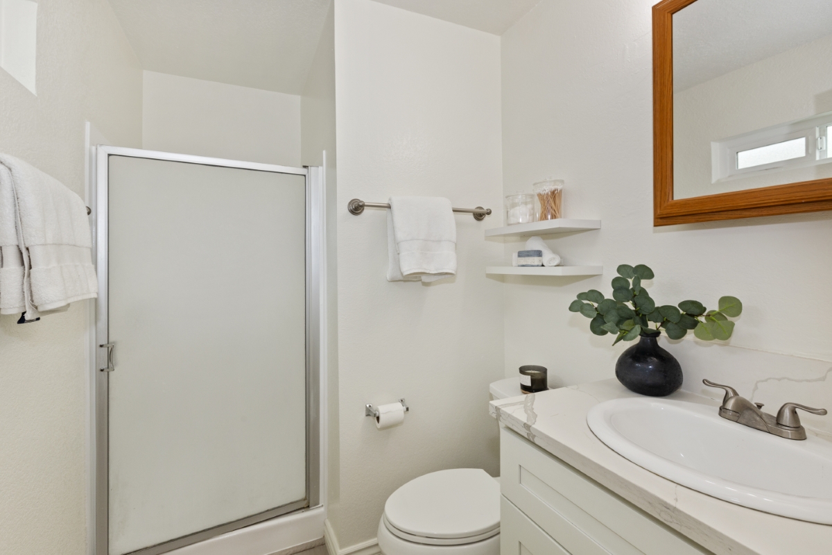 Upstairs, you’ll find a popular dual-suite layout, including a generous primary bedroom with walk-in closet, upgraded bathroom vanities, and re-finished showers in both upstairs baths. Additional highlights include an upstairs laundry closetprivate enclosed patio, and a detached 2-car garage with storage area.